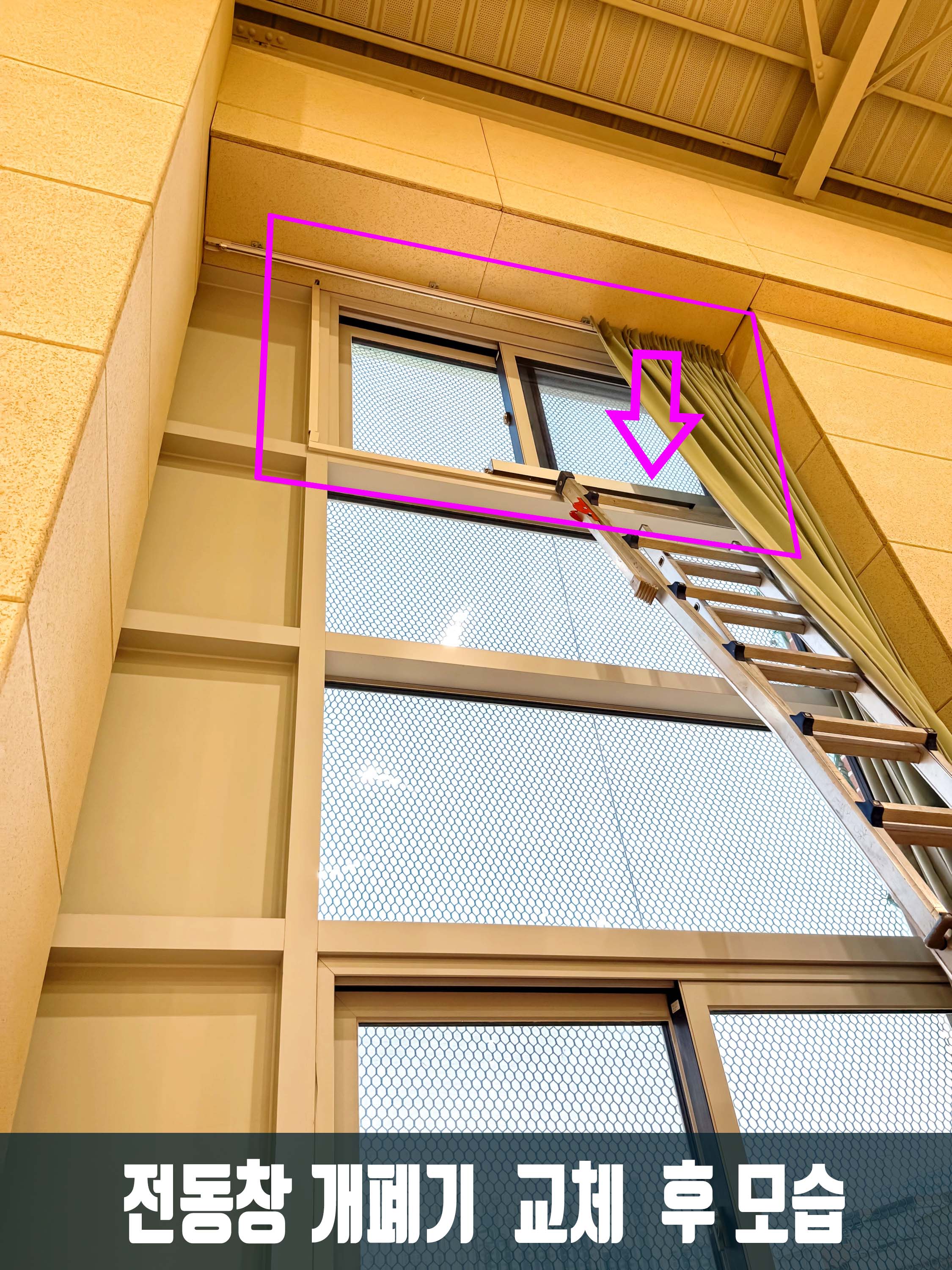 - 체육관에 설치된 구형 와이어 타입 전동 개폐기가 작동 불능 상태로 창문이 열린 채 멈춰 있었습니다.